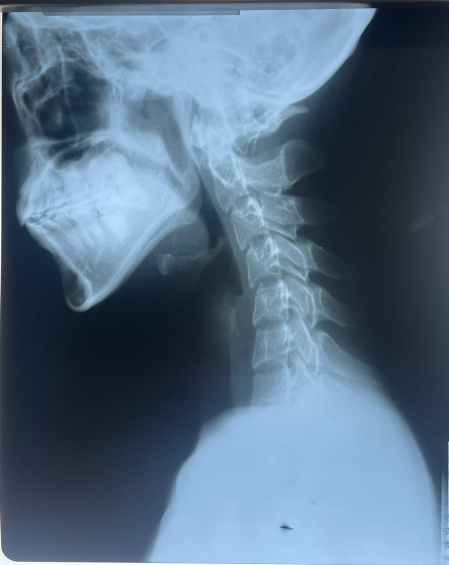 사경증 환자의 목을 X-ray로 보면 심한 역커브, 기울어져 있는 목, 들어져 있는 목 등이 복합되어 있는 것을 볼 수 있습니다. 경추가 앞으로 꺾이면서 옆으로 휘어있으면서 틀어져있다 보니 그 주변을 지나는 신경계에 혼란이 심해지면 목을 떨게 되는 연축성 떨림(Torticollis)까지 나타나는 것입니다.